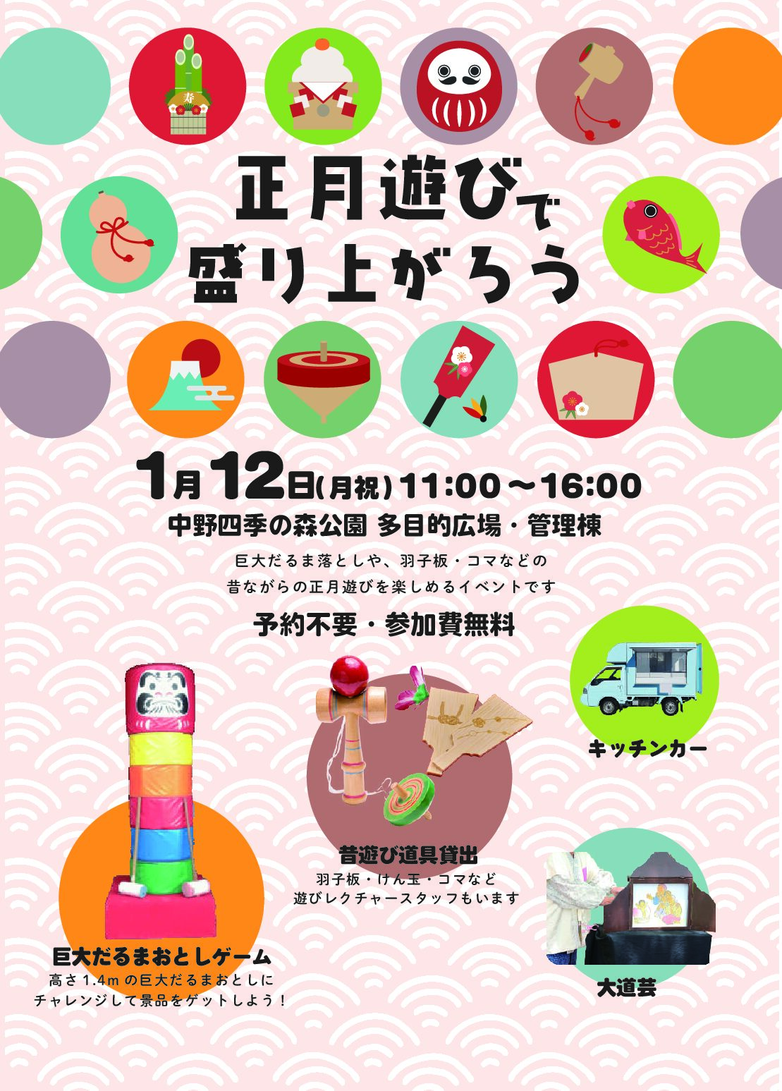 昔ながらの遊びが楽しめる子ども向けイベントです。 巨大だるまおとしや、昔遊び道具の貸出し、キッチンカー、大道芸など盛りだくさん。